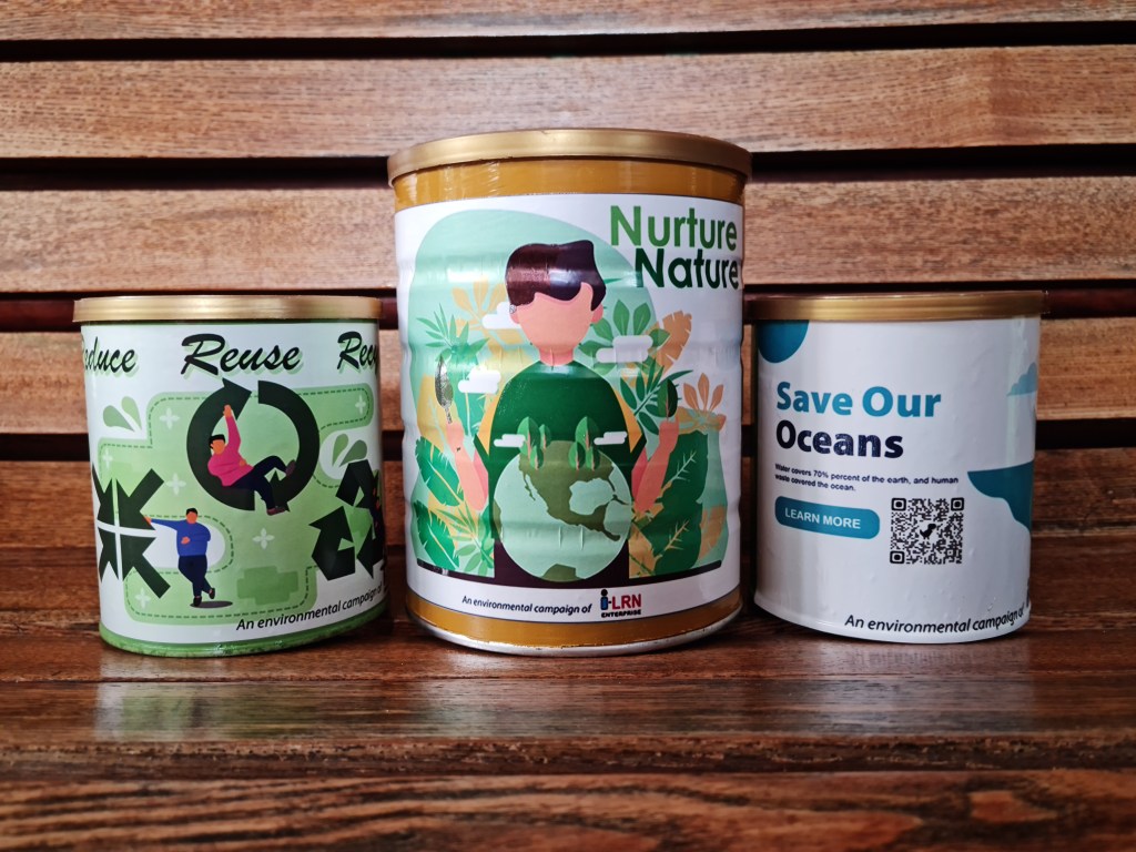 As a corporation, a non-government organization, an academic institution, a group and an individual, we can have our share in finding solutions to the global environmental problem. No matter how little, our share will still create a ripple that matters. I-LRN Enterprise reduces, reuses and recycles waste materials and strictly follows environmental laws and ordinances while advocating environmental protection and restoration. Its founder and owner recycles the cans of a plant-based nutritional product into a multi-use container by painting the exterior and pasting stickers on environmental care and restoration (#EnsureGold). His artist son converts the plastic cover into a radical wearable art. (Please see photos below.)